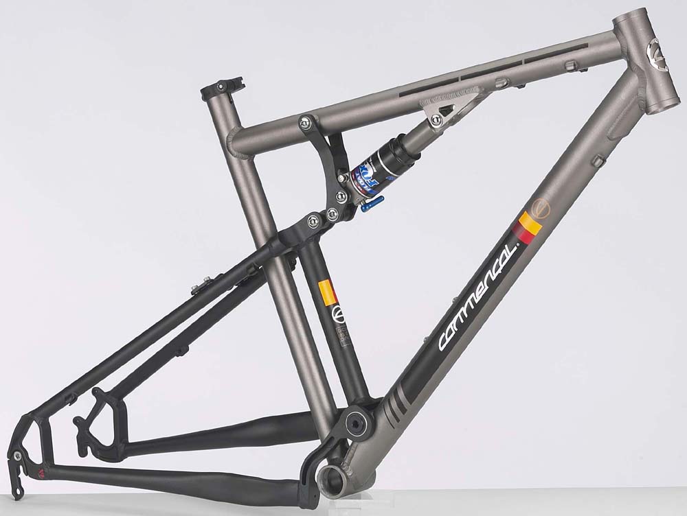 フレームジオメトリーと基本コンセプトは、ハードテイルのVIPと同じです。サスペンションが動いていることを、ライダーに感じさせないほど、スムーズに作動するよう設計されています。また、理想的なフレーム剛性を確保したうえでXCバイクに必須の「軽さ」(サスペンション、アクスル込みで2.2kg以下)を実現しています。さらに04からはビレットシステム(Mサイズ以上)により、ねじれに対する剛性も上がりました!