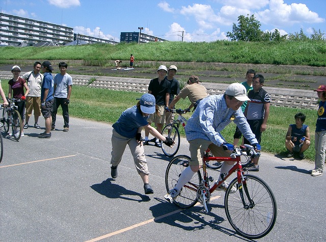 ライダーは一切漕がず、押して貰った力だけで何処まで走られるかを競う。押す方も大変ですが・・・・、