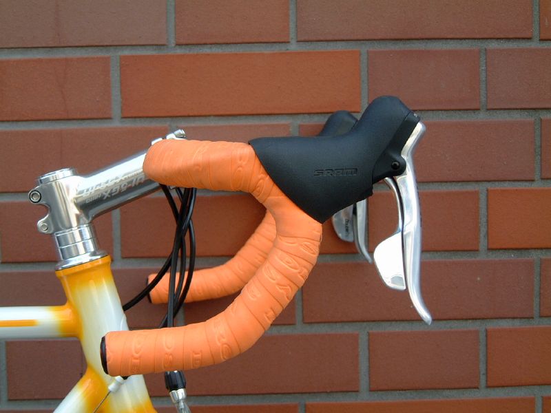 ヘッドチューブは敢えて少し長めにして、自然な感じでハンドルバー位置が高くなるように設計した。 通常この位置にハンドバーを持ってこようとするとスペーサーを沢山入れなければならなくなり、見た目が格好悪くなる。どうせハンドル位置を高くするのなら、ヘッドチューブを少し長めにしたほうが見た目はスッキリする。 ヘッドは通常はカンパ規格なのだが、今回はケーンクリーク規格でやって貰った。このヘッドの規格は何とかならないモンかなぁ。 ハンドルバーは日東のニートM.184。ハンドルバーからレバーブラケットにかけて殆ど真っ平ら。最近流行のデザインだ。個人的にはしっかりと谷が有る方が好きだけど。 |