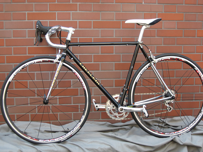 | 形はホリゾンタルスタイルにこだわり、全体的にメッキを生かしたデザインになった。基本的にモノトーンで、所々に差し色を入れた。 スチールレーサーにはこのカンパ・アテナが非常によく似合う。昔は当然のようにパーツ類は銀色だったのが、昨今はカーボンの黒や、アルミでもわざわざ着色されたモノが増えた。ちょっとクラシックなイメージでシルバーの現行パーツとなると必然的にアテナになってしまう。2011シーズンではシマノ・アルテグラと比べても金額的に余り変わらず、そう言う意味でもとても使いやすいコンポーネントパーツだ。 |