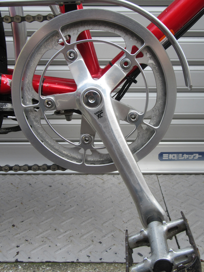 クランクは懐かしのサンツアーXC(スギノ製)の何故か170om。 多分175oも出ていたと思うのだけどなぁ〜。 元々使っていた46TにDIXNAのラインガード(PCD110mm・Φ200mm)を装着。 どう?かなりしっくりじゃないですか?