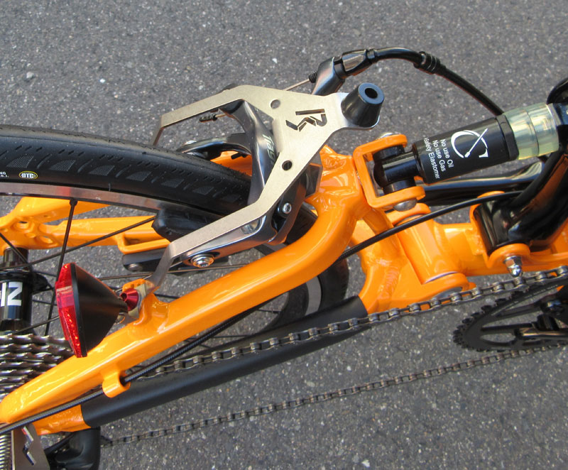 純正のオプションパーツ「リアブレーキバンパー」。折りたたみ時に突出するリアブレーキを防御する為にステンレスプレートで作られている。