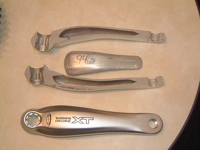 XTとLXのクランクがマイナーチェンジされた。写真は従来のXTとマイナーチェンジなったXTクランクのカットモデル。外観は横幅が一部広くなり、より剛性を高めると共に、内部の中空構造を大きくし、30gもの軽量化に成功している。このようなカットモデルを目の当たりにすると、改めてその精密且つ大胆な作りに驚かされる。