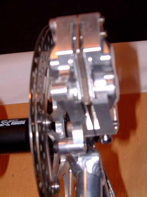 プロトタイプのツインローターディスク。 (説明パネルより) 「極端に制動力を上げたブレーキの使い勝手を試すために試作された、ツインローターを備えたプロトタイプモデル。デイブ・コリナンやリー・ドノバンと共にテストを繰り返した。あまりに高い(選手の意志とかけ離れた)制動力のため、選手からは、コントロールしにくい、という意見が出た。選手が求めているのは闇雲に高い制動力ではなく、選手の意志に忠実に反応するブレーキなのである。シマノは、必要な制動力を確保した上で、ライダーの入力にリニアに反応するブレーキ開発を進めます。」 |