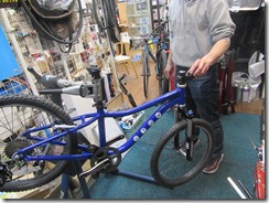 パパ奮闘する! 常連のお客様が息子さんの誕生日に間に合わせるべく奮闘中! 随分とカタチになってきました。 随分と以前に別のお客さまが要らなくなったからと譲って下さったスペシャライズドのキッズMTBをベースに、フレームもリペイントして、サスも20インチながらエアサスに!勿論パパ自ら組み立てています。パパの気合いが感じられます! ここまでやったらヘッドパーツはキングで!と薦めましたが流石に「それはやり過ぎでしょう」と(笑)