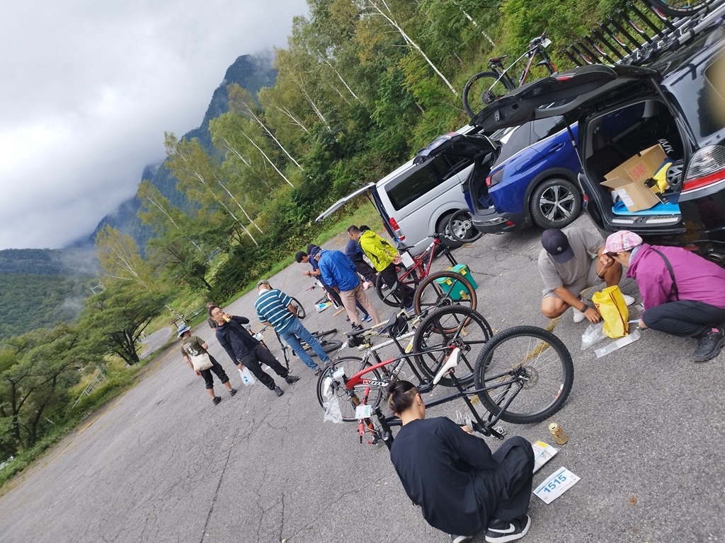 しゃがんで休憩している彼のバイクはスラムの電動メカなのだけど、有ろうことかバッテリーを忘れて来て、折角12枚もギアが付いているのにシングルギア状態。前日の受付の時くらいに気が付いて「どうしよ~!」と言ってたのだけど、どうしようも無い。ウチのオジサン達は「(ブースを出していた)シマノに文句言うて来い!」とか言うてるし。