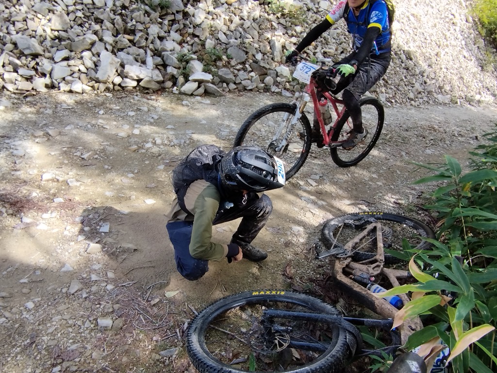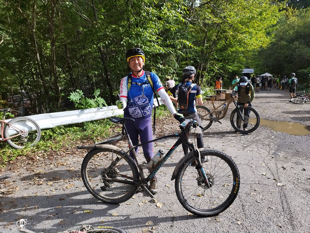 御岳が凄く綺麗に見えた。今年は第1CPまでの距離が約6㎞ほど短くなったので、足切りに遭う心配はまず無いのも有り、写真を撮ったりする気持ちの余裕があった。もうレースと言うよりはかなりハードなMTBツーリングって感じ。