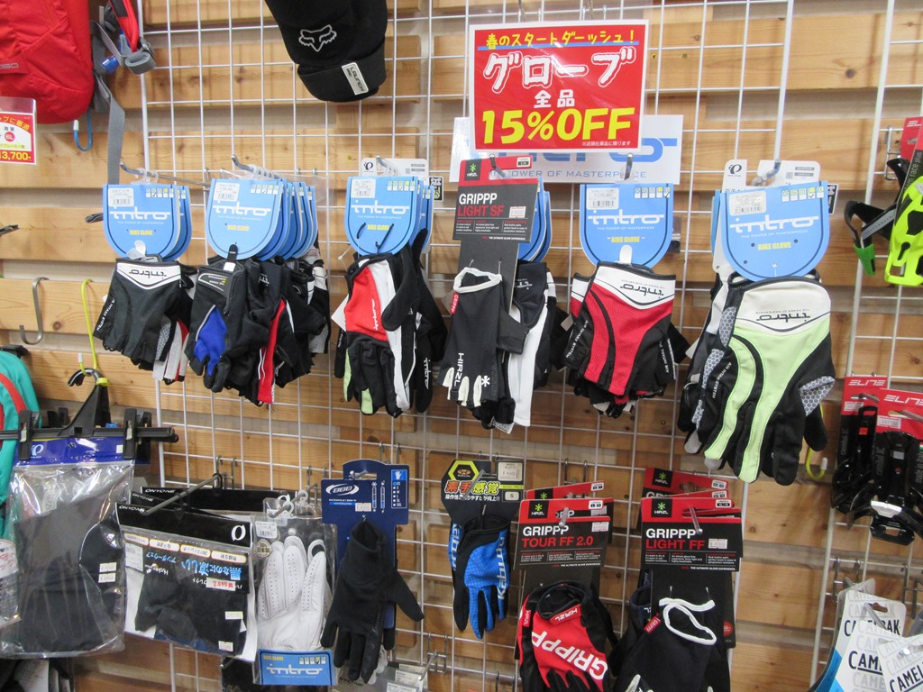 春夏グローブ・15%OFFセールしてます! あったかくなりましたね~。 というわけで、店頭のグローブを秋冬ものから春夏ものにチェンジしました! 春の自転車ライフのスタートダッシュ!を応援するため、今、春夏グローブを現金特価で表示価格より15%OFFにてご提供しています。 店頭在庫品のみで、4/16(木)までの期間限定セールですのでお早目に! 今春から自転車に乗って楽しむぞ!って方も、去年使っていたグローブを出してみたら意外と傷んでたって方も、ぜひぜひこの機会にゲットしてくださいね~。